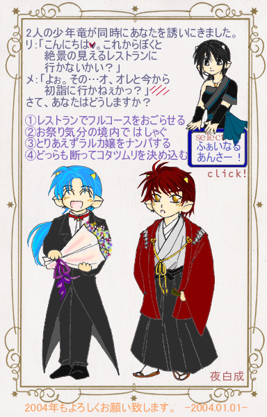 那岐蓮奈さん作、クイズ・ミリオネア風年賀イラストです。2004年の年賀状としていただきました。