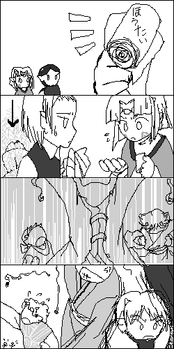 「音声解説」は僕が後から付け加えたものです(まだセリエの子竜たちについては口調が明らかに なっていないということで、当初はサイレントの作品としていただいたものです(笑))。 (作者のコメントより) 『Rendezvous』を読んでいた時に… 竜医はどこにでもいる訳ではない→助けが呼べない状況だとさらに困る→ セリエの子竜らは、怪我や病気への対応は必須として教えられるだろうな と連想しまして、結果がこの4コマです。 | |